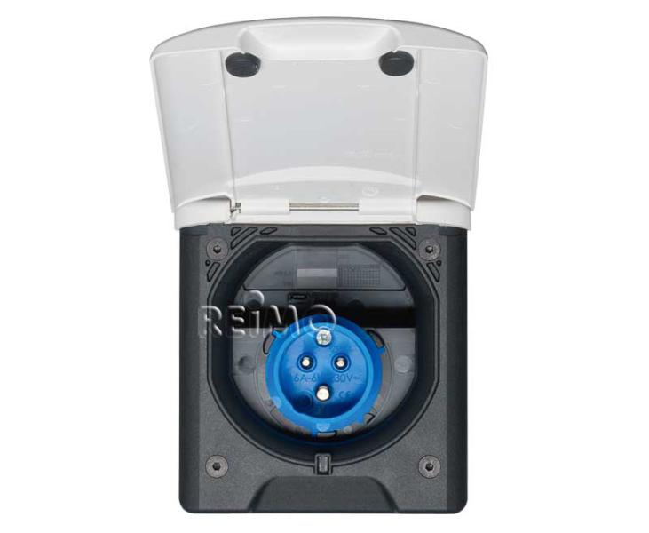 CEE feeder plug with magnet lock. So the lid keeps Close even during the ride and strong winds. 120 x 135 mm. Installation pot round, Ø 95 mm, with hinged lid, white.